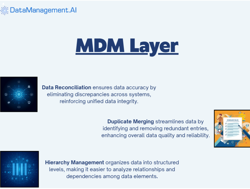 It ensures consistency and governance across the entire ecosystem. MDM is like a keeper of all the data as it is responsible for reconciling data conflicts, merging duplicates, managing hierarchies, taxonomies, and relationships.